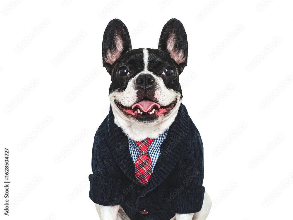 Stylish dog, blue shirt and red tie. Dog smile. Studio shot, isolated background. Closeup, indoors. Pets care concept