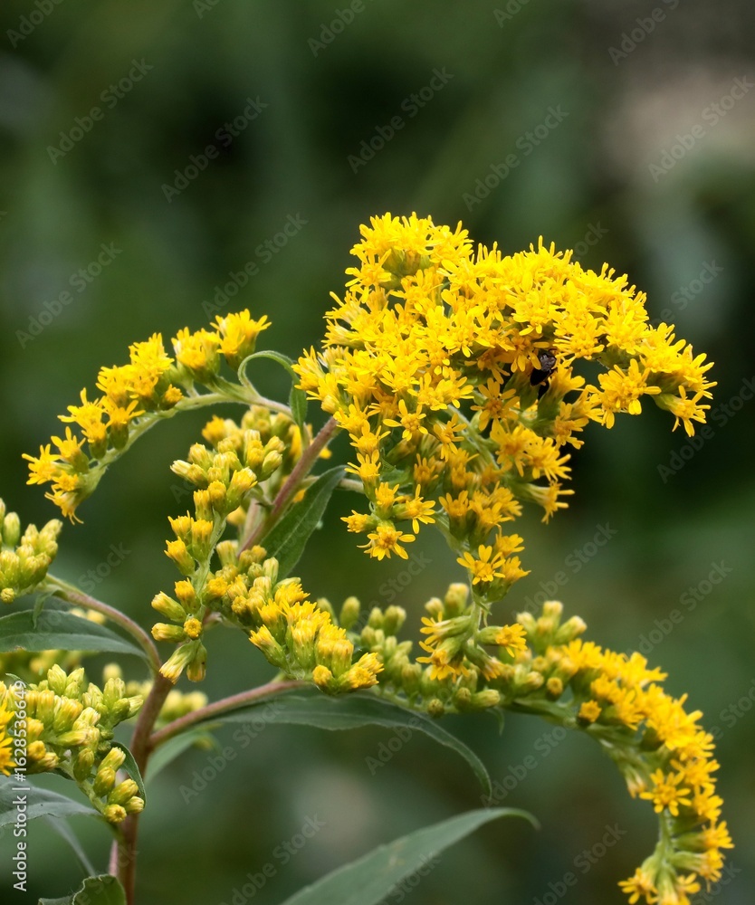 yellow inflorewscences flowers of Solidago Canadensis wild plant close up