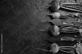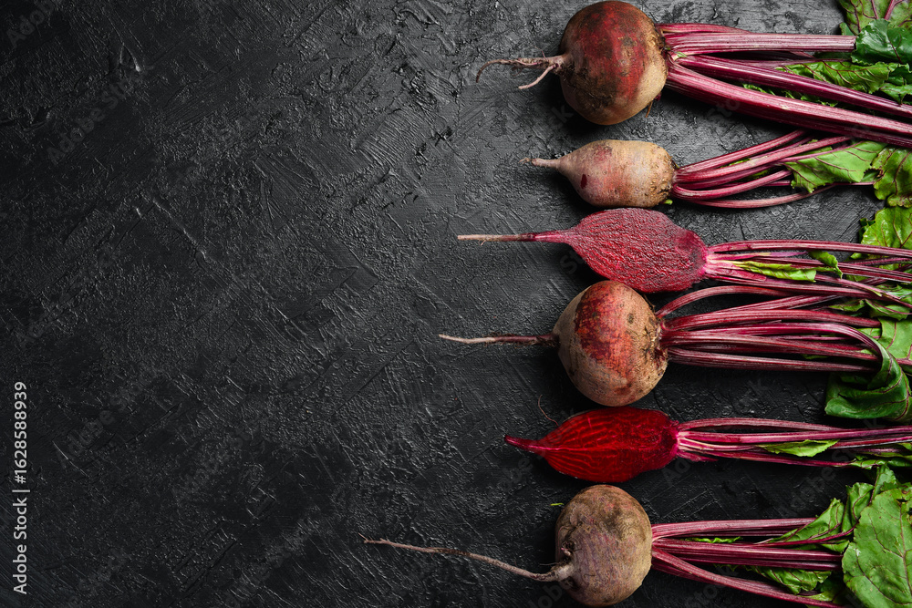 Bunch of organic beetroot on textured stone background. Free space for text. Top view. Food concept.