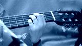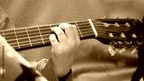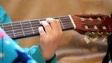 Child's hand pressing strings on classical acoustic guitar neck during home practice, closeup view of fingers forming a chord on wooden fretboard, music education and instrument learning concept