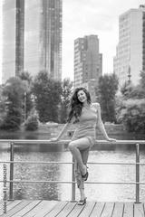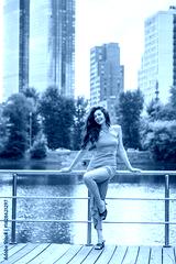 Young beautiful brunette woman in blue knitted dress posing in summer park