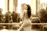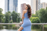 Young beautiful brunette woman in blue knitted dress posing in summer park