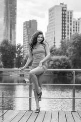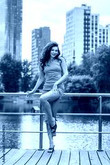 Young beautiful brunette woman in blue knitted dress posing in summer park