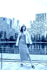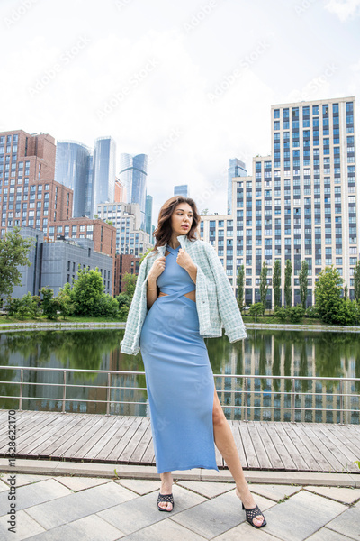 Young beautiful brunette woman in blue knitted dress posing in summer park