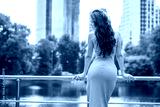 Young beautiful brunette woman in blue knitted dress posing in summer park