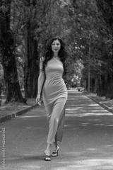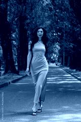 Young beautiful brunette woman in blue knitted dress posing in summer park