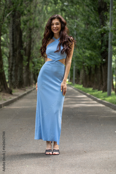 Young beautiful brunette woman in blue knitted dress posing in summer park