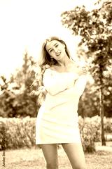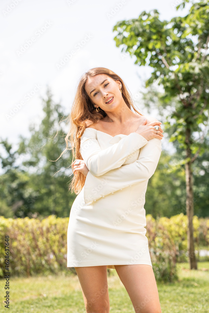 Young beautiful model in a white short dress with long sleeves