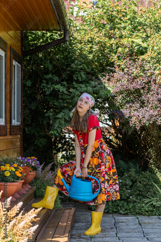 Portrait of a teenage girl with a watering can and in yellow rubber boots