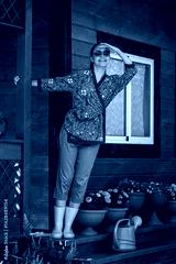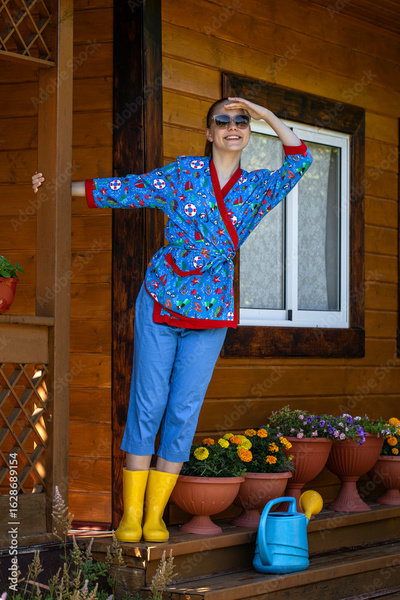 Full body portrait of a teenage girl in a blue robe and yellow rubber boots
