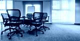 Ergonomic office chairs around a small conference table. Black and white with copy space. Banner format