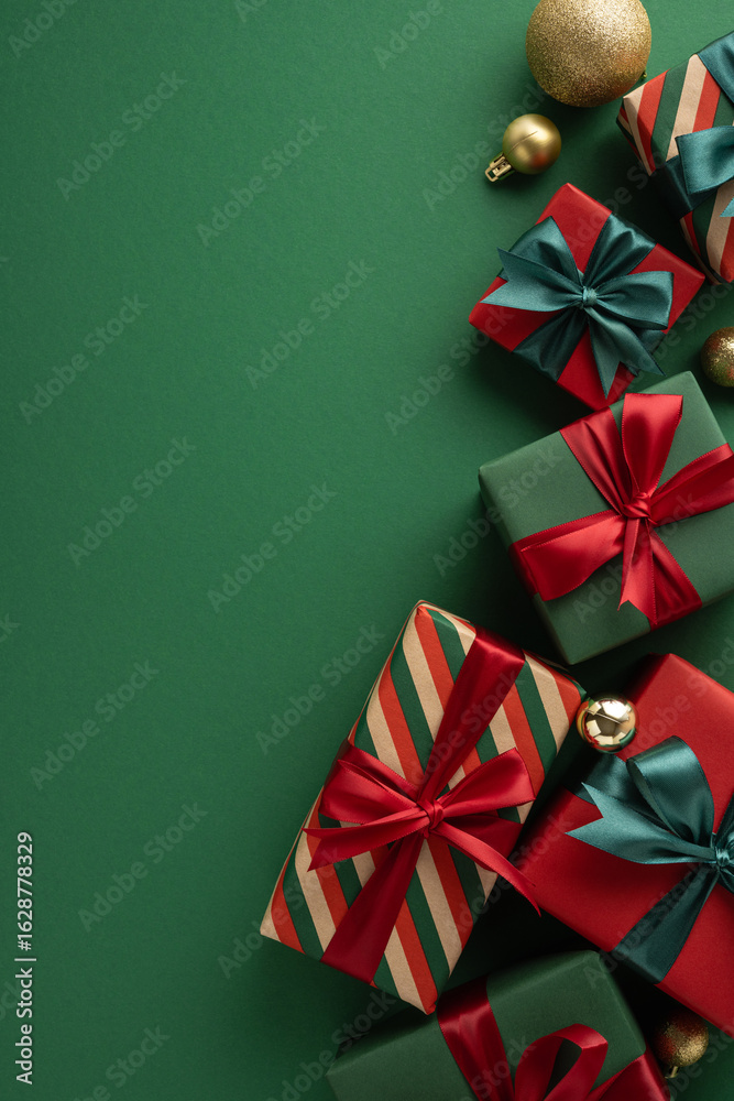 A vertical selection of Christmas presents wrapped in colorful paper with ribbons on a green background surrounded by festive ornaments