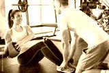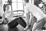 Fitness instructor assisting young sporty woman while exercising with fitness ball on exercise mat at gym.