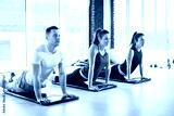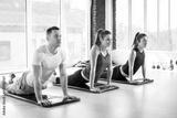 Three young sporty people doing plank exercise on yoga mat in fitness center.