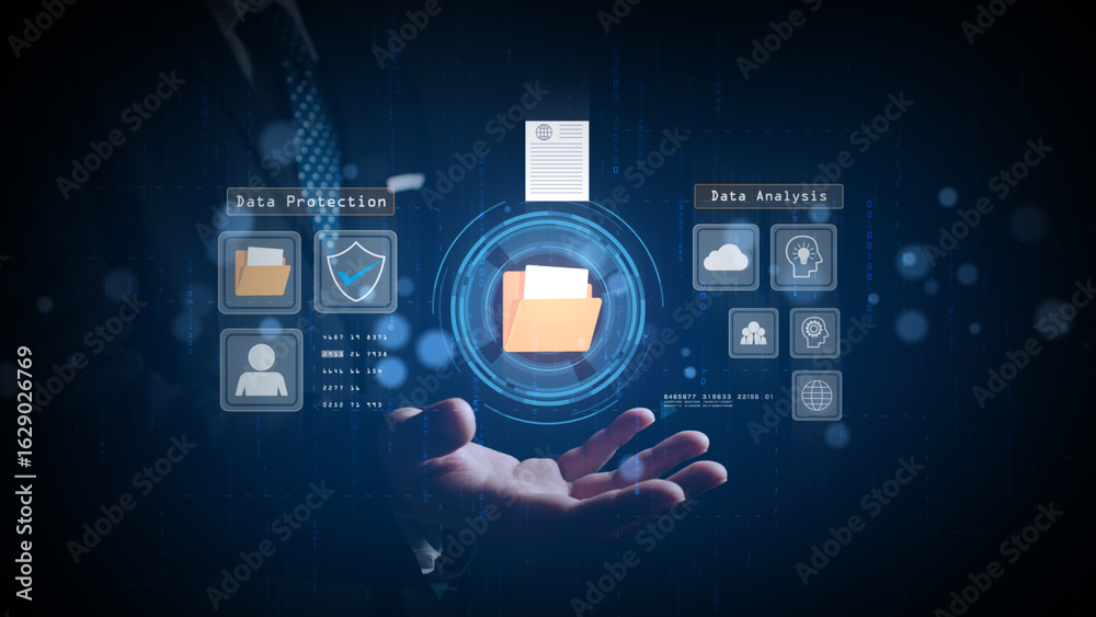 Modern digital interface for big data analysis and secure data protection with file management system in futuristic business concept. 3d Rendering
