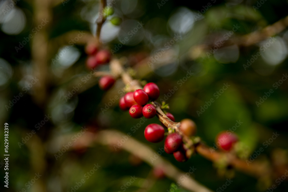 Farmer concept harvest fruit ripe coffee seed robusta arabica berry close up fresh green leaf bean picking orange crop red yellow berries raw plant tree farm growth blur background eco organic garden
