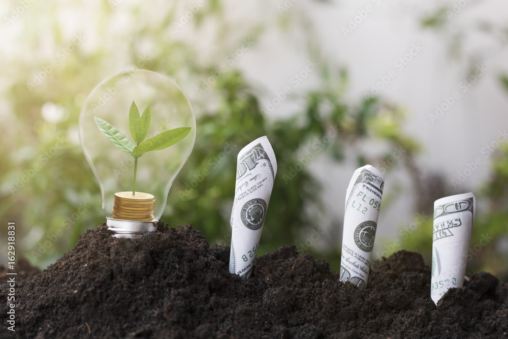 tree planting and growth up on money coin, stacked on light bulb with soil and dollars, banknote. concept in save World environment day reforesting eco bio arbor CSR ESG ecosystems concept
