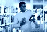In household department of store, African American man choose dishwashing soap, examine products from different manufacturers, select some goods. Customer stares at assortment