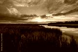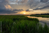 Sunset over a tranquil marsh highlighting lush greenery and reflective water in a serene landscape