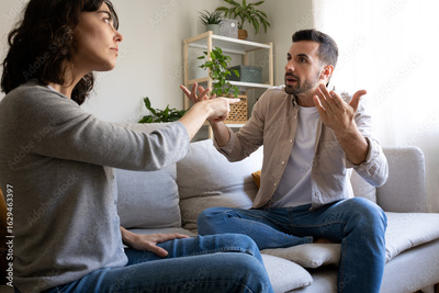 Wife having an argument with husband. Woman is angry with man. Divorce, couple fighting.