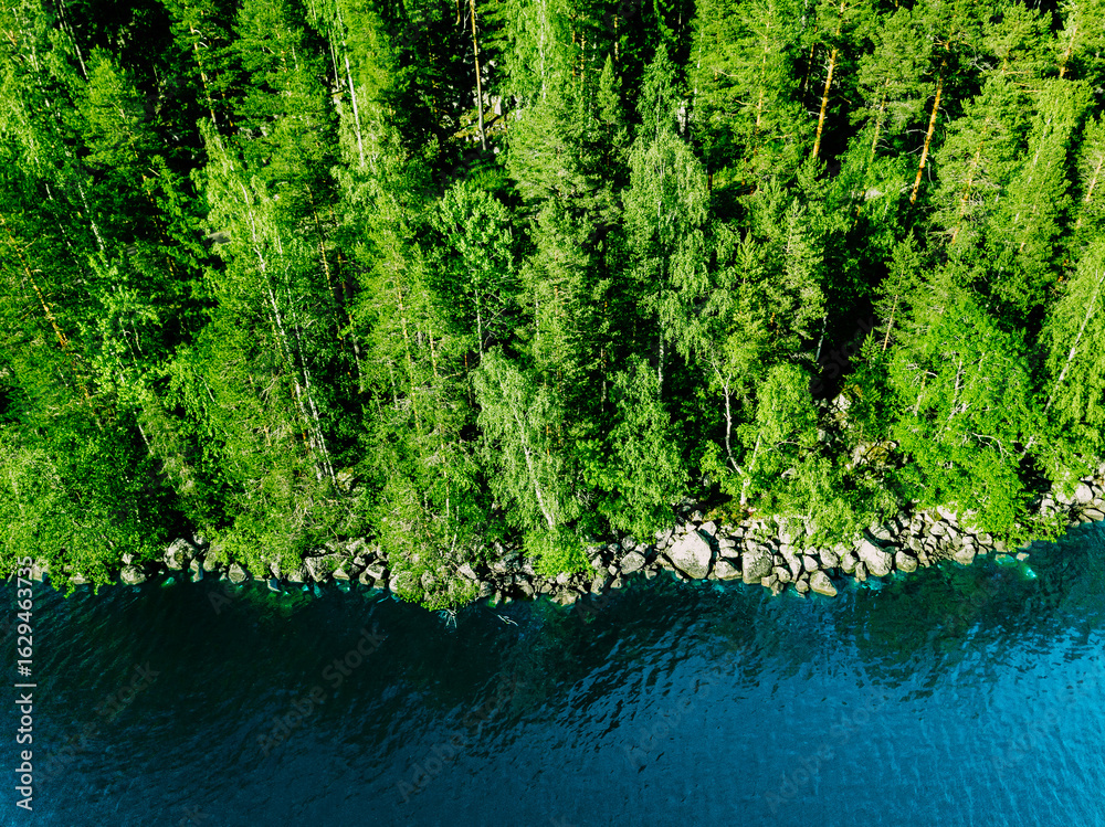 Aerial drone view of green summer woods with rocks and blue water lakes in Finland.