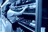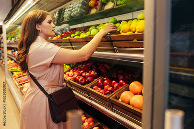 Young woman customer takes out a green apple from the shelf in the grocery store