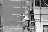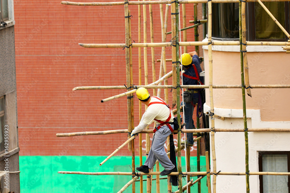 Workers working on a bamboo scaffold in Hong Kong. People with unrecognizable faces.