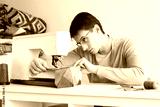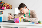 quilting and patchwork in the workshop of tailor male - at the sewing machine man the tailor sews brightly colored patchwork of cloth, he bowed his head over the work