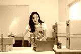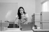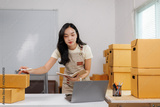 Young asian woman entrepreneur checking cardboard boxes in home office