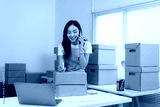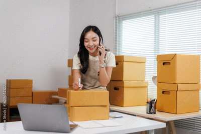 Asian female entrepreneur writing address on cardboard box while talking on smartphone