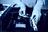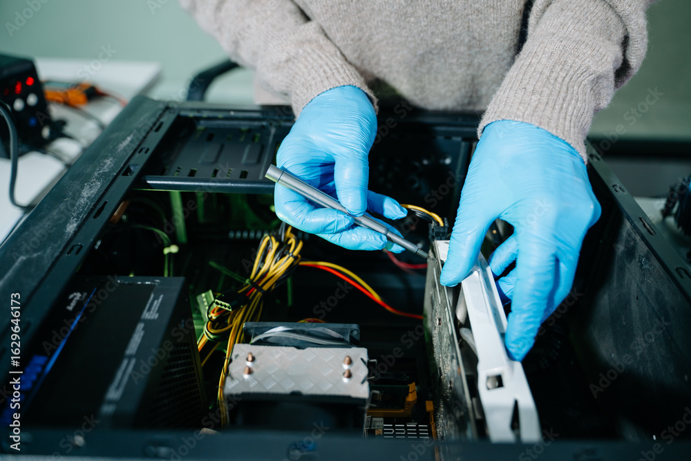 Computer technician in gloves safely repairing desktop hardware. Close-up view of hands fixing GPU and motherboard inside open PC case. Perfect for tech and repair concepts.