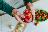Hands of a person holding pickled cherry tomatoes