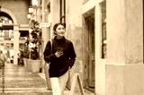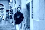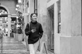 Pretty asian woman in knit sweater holding phone walking and looking around shopping mall or market.