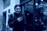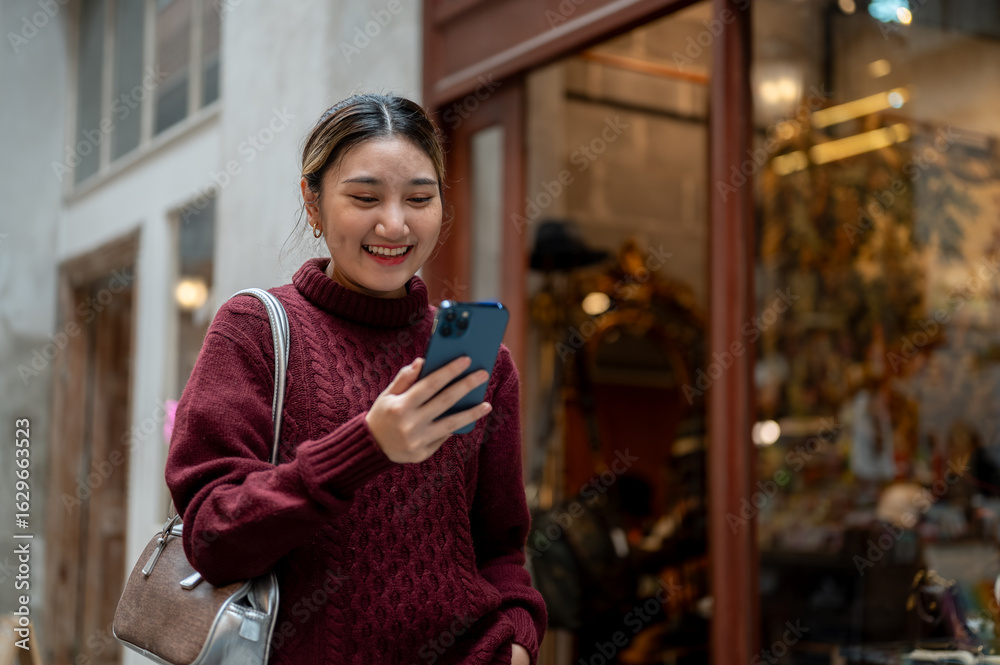 Smiling asian woman in knit sweater looking at smartphone while walking in shopping mall or market