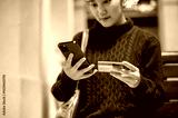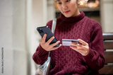 Asian woman holding credit card and looking at phone while sits on bench in shopping mall or market.