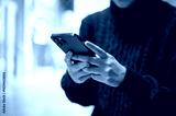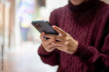 Close up of woman's hand holding or typing on phone with both hands while sit or stand in a building