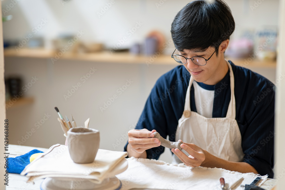 Potter artist molding clay to make handle of clay mug on working table in a pottery class or studio