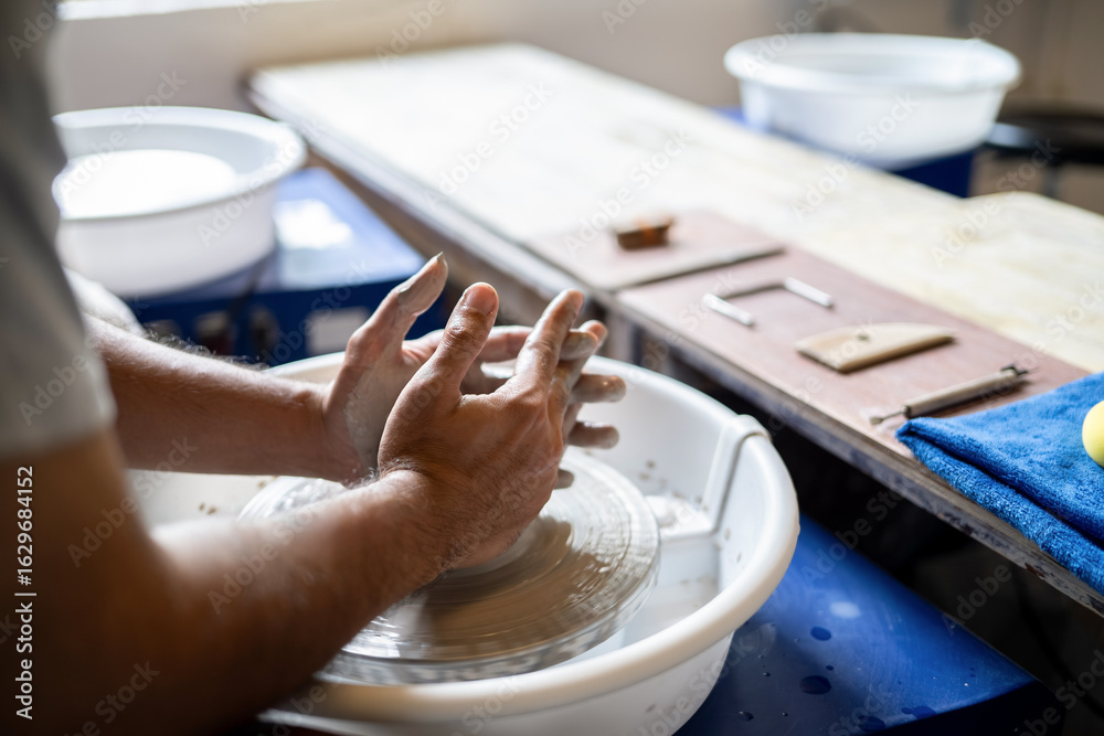 Close up of pottery artist's hands shaping a clay on spinning throwing wheel in a class or studio