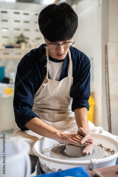 Young man pottery artist molding clay into a bowl on spinning throwing wheel in a class or studio.