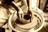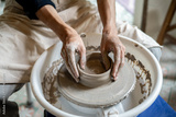 Close up of pottery artist's hands making a clay bowl on spinning throwing wheel in class or studio.