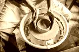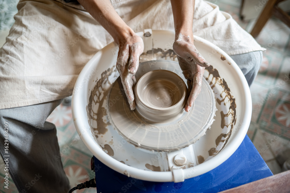Close up pottery artist hands molding clay into bowl on spinning throwing wheel in a class or studio