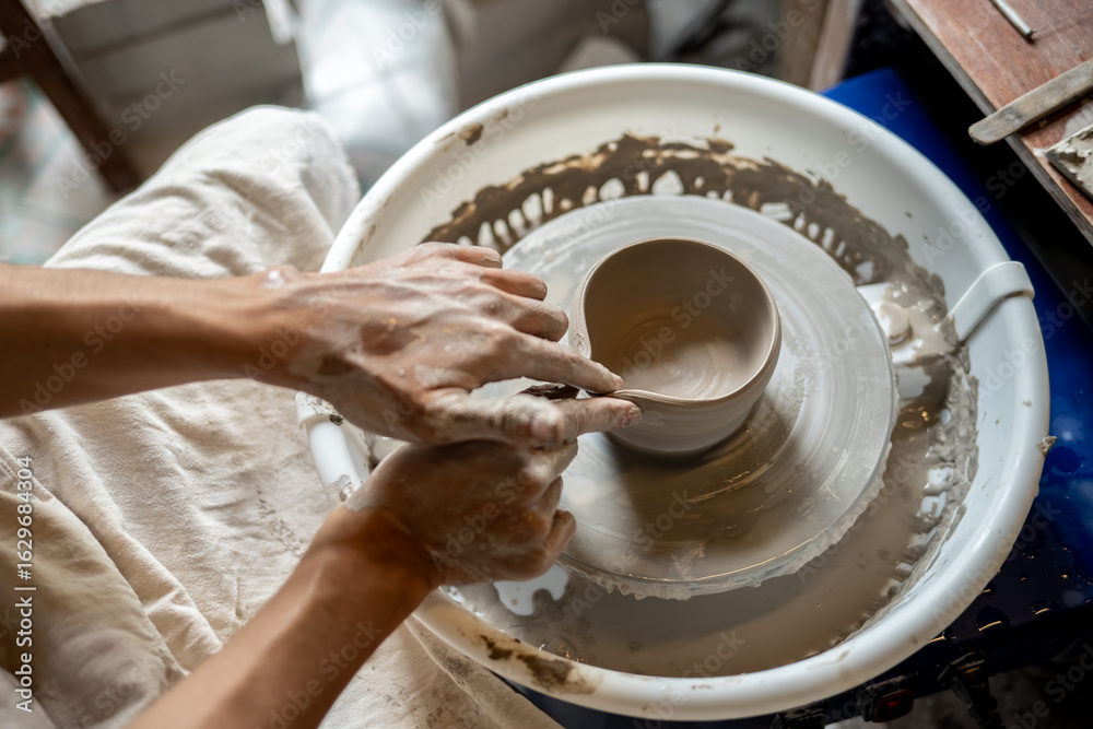Pottery artist hand making clay into tea brewing bowl on spinning throwing wheel in class or studio.