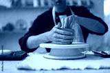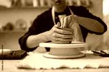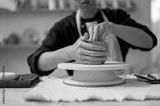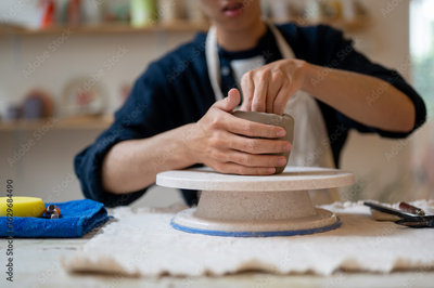 Young man pottery artist shaping a clay mug on throwing wheel at working table in class or studio.