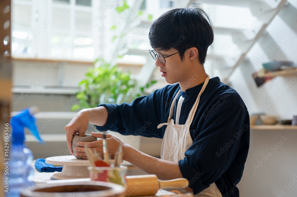 Glasses pottery artist molding clay into a mug on throwing wheel at working table in class or studio