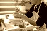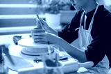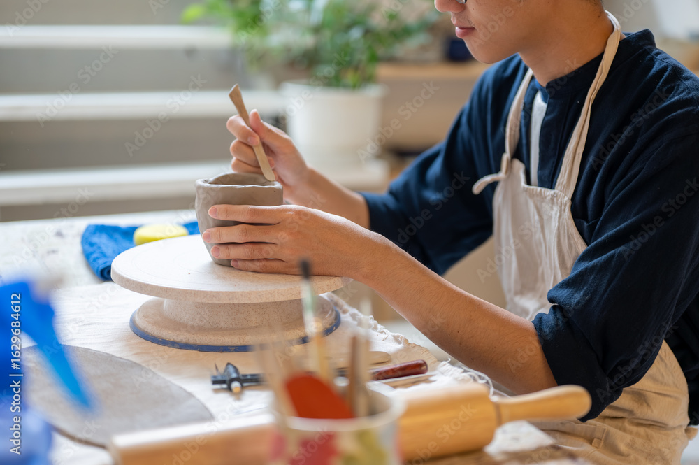 Young pottery artist using a throwing tool to make clay mug at working table in a class or studio.