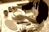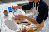 Pottery artist using modeling tool on clay slab on throwing wheel at work table in class or studio