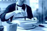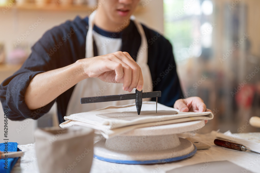 Pottery artist using clay compass cutting circle on throwing wheel at work table in class or studio.