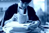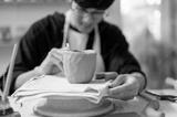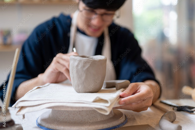 Pottery artist using tool adding texture to clay mug on a wheel at working table in class or studio