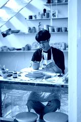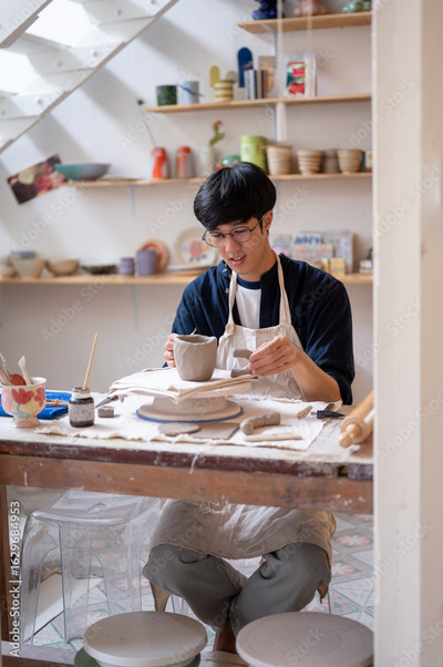 Pottery artist holding handle to a clay mug on throwing wheel at working table in a class or studio.