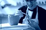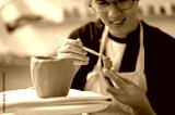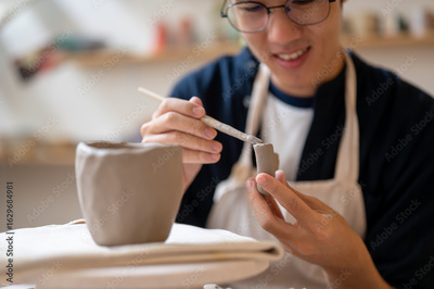 Pottery artist holding brush adding clay slip to glue mug handle at working table in class or studio